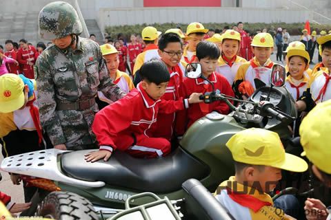 濟(jì)南小學(xué)生在軍營(yíng)里現(xiàn)場(chǎng)親身體驗(yàn)武器裝備。(東方IC版權(quán)圖片)